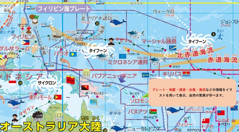イラストを多く表記して子供が楽しく学べるように工夫してあります。 プレート・地震・津波・火山・台風・海流の流れ・大航海時代の航路などの地理情報が1枚のポスターの中に分かりやすく集約。