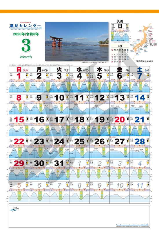 東京・晴海を基準として、年間毎日時々刻々の潮位を曲線で描画し、海浜・磯辺で楽しめる干潮時間帯の表示、日の出・日の入時刻、旧暦、六曜、24節気、雑節、潮名、月齢、月相、月の朔望情報など、海洋レジャーから日常生活まで幅広く使用できるカレンダーです。