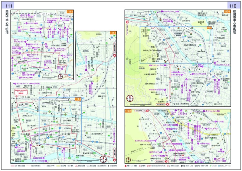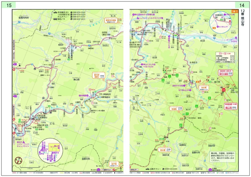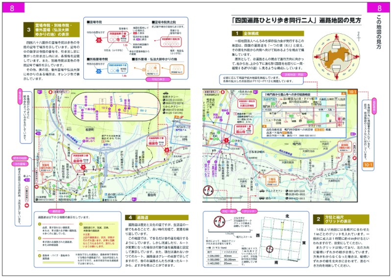 宿泊施設としては、宿坊、民宿、ビジネスホテルなど、あわせて約650件の宿泊施設の住所と電話番号が一覧表になっています。さらにその詳しい位置が、地図の上に表記されているので、現地で宿を探すときも安心です。宿泊施設一覧表には、前後の札所との距離も記されているので、日程の計画をたてるには大変便利です。地図はナビのように歩く向きに右から左へつなげてあります。北が上になっていませんので、全地図に方位を示してあります。