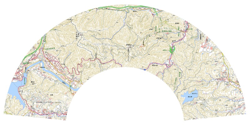 東京近郊で年間通じて多くの人が訪れる高尾山ですが、地形図では八王子の西端、与瀬の東端ということもあって、高尾山近辺全体を1枚で見ることができませんでした。まさしく図郭や範囲の問題で作成が難しかった場所で、NEW地図扇子の特徴を活かした図取りとなっています。