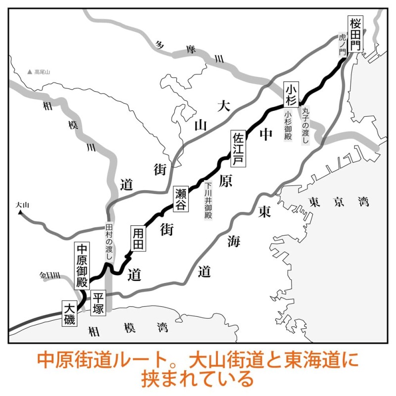 中原街道は、江戸と相模・中原(平塚市)を結ぶ歴史古道です。古代からの重要なルートで、東京中心部と東海道を結び、西へは京都・大坂へ、北へは奥州のルートにつながります。