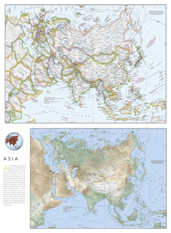 綿密な調査とデザインに基づき作成されたナショナル ジオグラフィックの地図は、他の参考地図の基準となる、アジアを代表する地図です。地図面には、国、都市、その他のランドマークを示す政治地図と、山脈や河川などの地形を示す地形図が掲載されています。