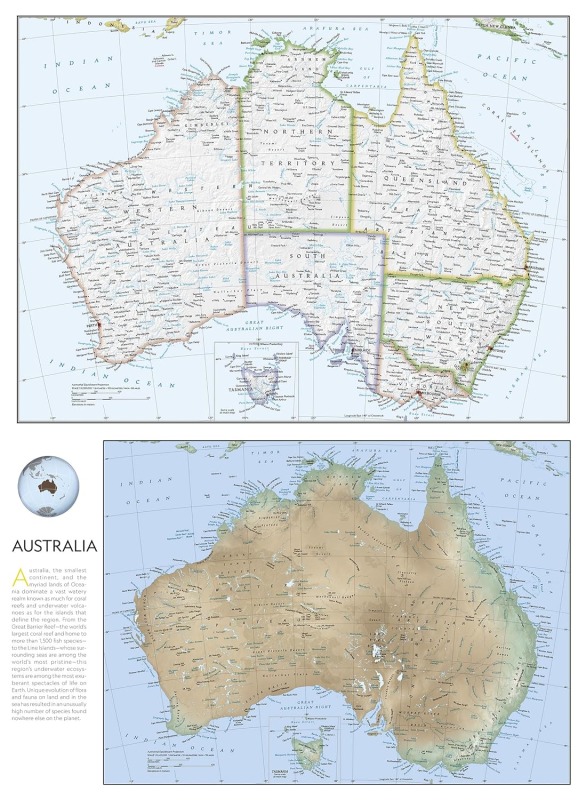 綿密な調査とデザインに基づき作成されたナショナル ジオグラフィックの地図は、他の参考地図の基準となる、オーストラリアを代表する地図です。地図面には、国、都市、その他のランドマークを示す政治地図と、山脈や河川などの地形を示す地形図が掲載されています。国旗・事実面には、南極大陸の地図が併記されています。