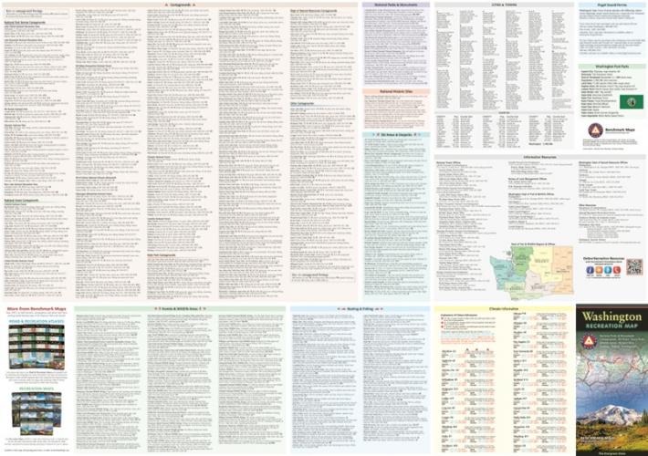 ワシントン州レクリエーションマップは、ワシントン州道路・レクリエーションアトラスに掲載されているレクリエーションガイドのページを折り畳んだ地図です。地図面には、公有地、詳細な道路情報、地点間の距離、レクリエーション施設、キャンプ場、公園・野生生物保護区、ボート・釣り場、狩猟区域(GMU)などが掲載されています。裏面には、州全体のPOI(地点情報)が分類別にリストアップされ、役立つ説明、最新の連絡先情報、地図上のグリッド座標が記載されています。