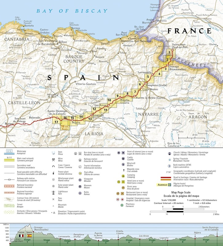 カミーノ・デ・サンティアゴ地形図ガイドには、2cm=1kmの縮尺で詳細な地形図が掲載されています。各ページはトレイルの中心に位置し、隣接するページと重なるように設計されているため、迷う心配はほとんどありません。各ページの下部には、町、休憩所、トレイルへのアクセスポイント間の距離を示すトレイルプロファイルが掲載されています。地図とトレイルプロファイルは、トレイルを歩くための視覚的なガイドとして役立ちます。