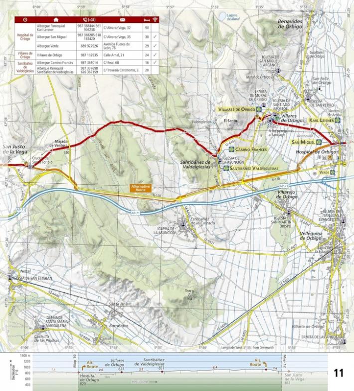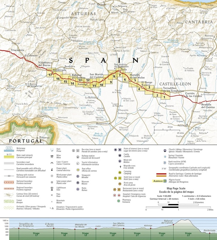 カミーノ・デ・サンティアゴ地形図ガイドには、2cm=1kmの縮尺で詳細な地形図が掲載されています。各ページはトレイルの中心に位置し、隣接するページと重なるように設計されているため、迷う心配はほとんどありません。各ページの下部には、町、休憩所、トレイルへのアクセスポイント間の距離を示すトレイルプロファイルが掲載されています。地図とトレイルプロファイルは、トレイルを歩くための視覚的なガイドとして役立ちます。